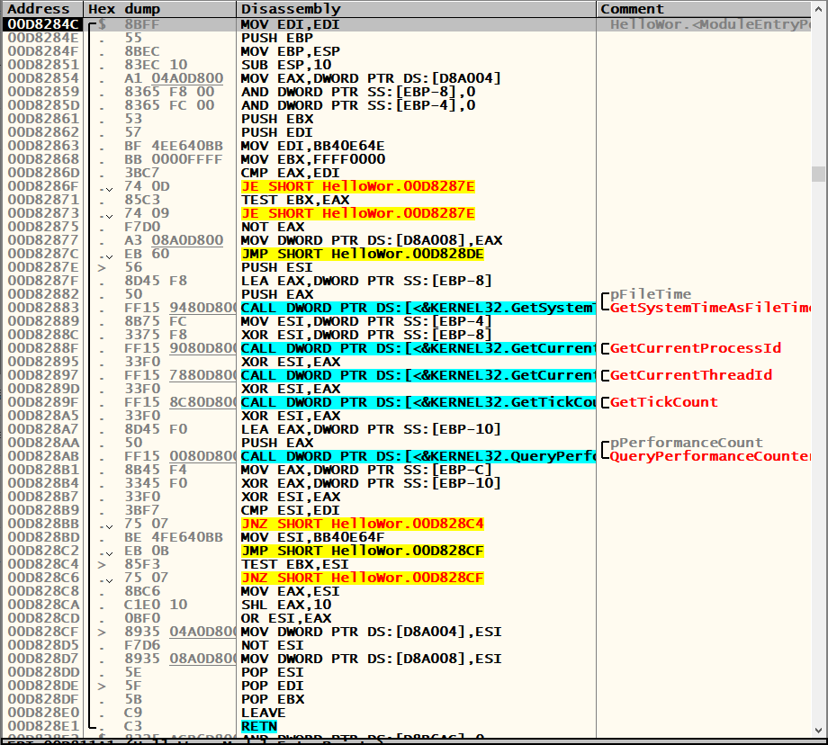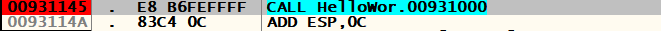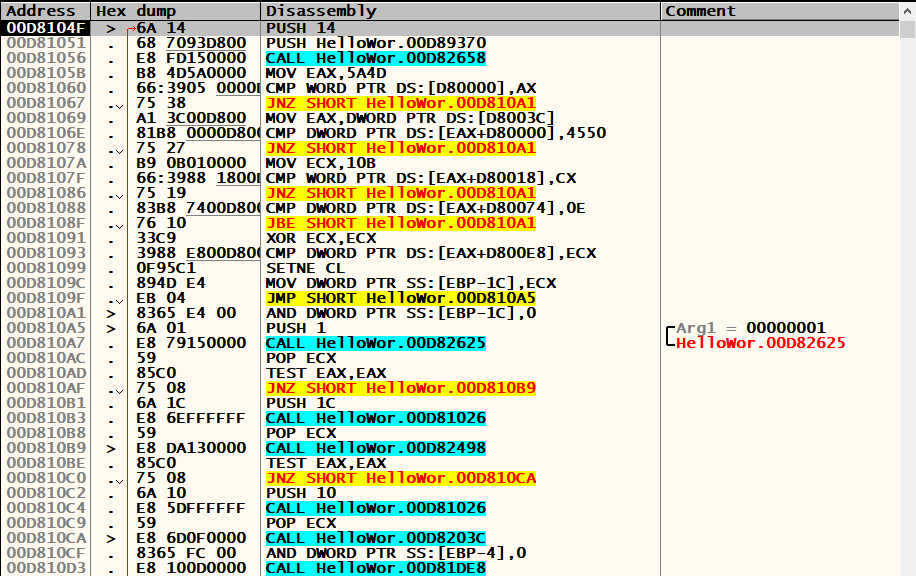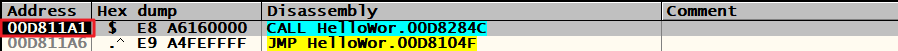 EP(Entry Point)는 HelloWorld.exe의 실행 시작 주소(00D811A1)이고,