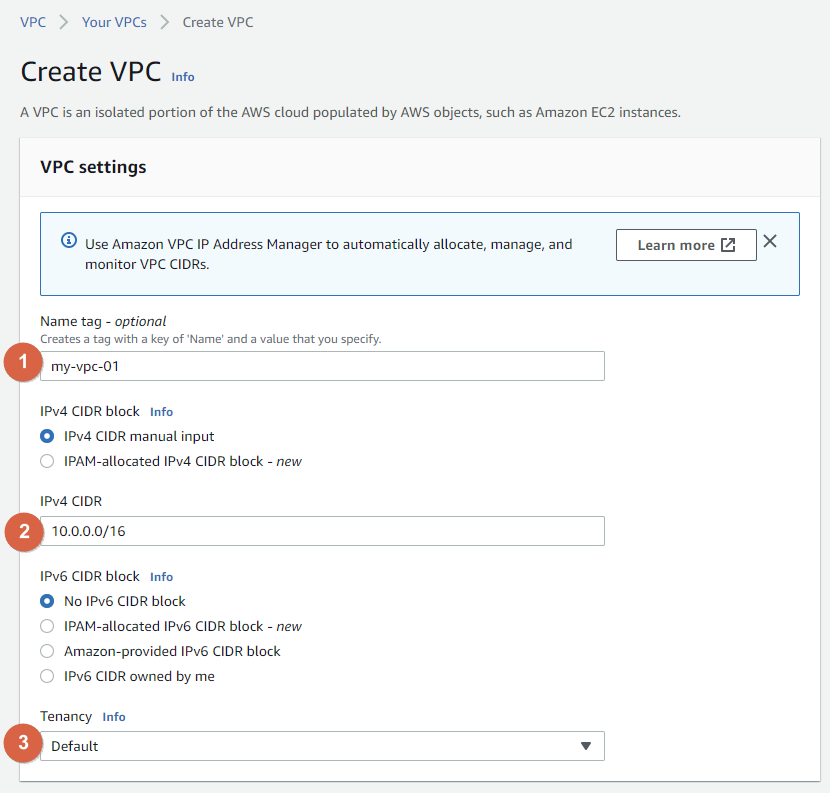 - Name tag : VPC를 구별하는 이름