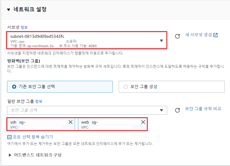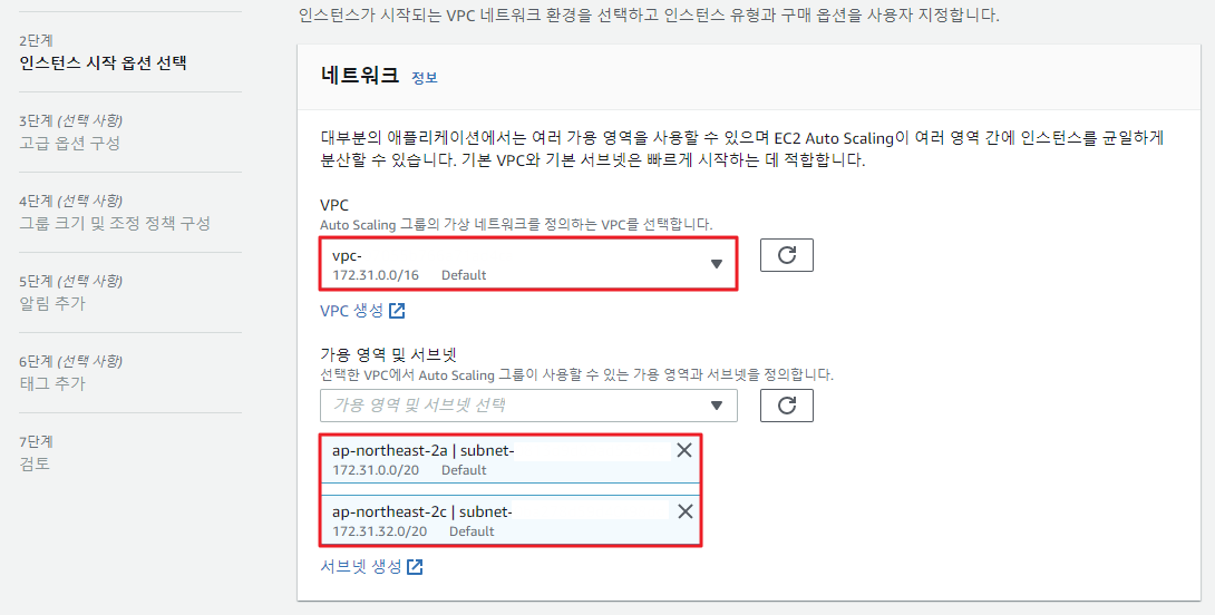 ④ Auto Scaling 그룹에서 실행할 인스턴스의 서브넷과 보안 그룹을 선택