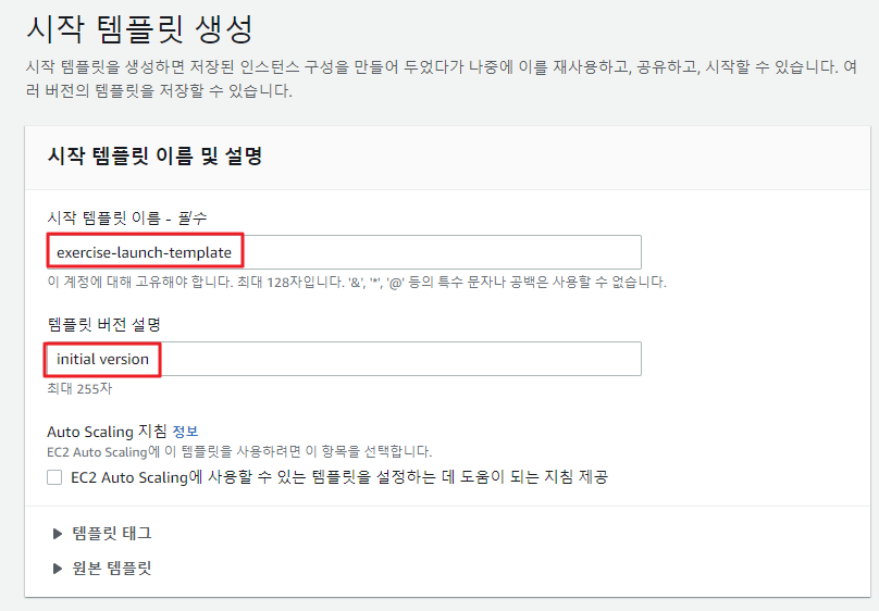 시작 템플릿의 설정값 지정 ① 시작 템플릿 이름, 버전 설명 작성