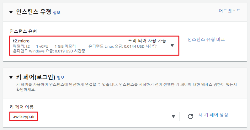 ③ 인스턴스 유형은 t2.micro, 키 페어는 이전에 EC2 인스턴스를 생성할 때 내려받은 키 페어를 선택한다.