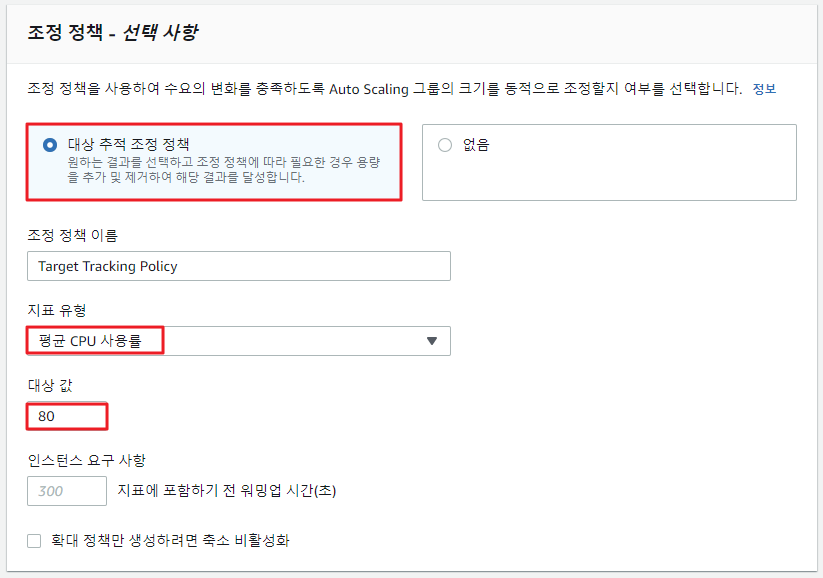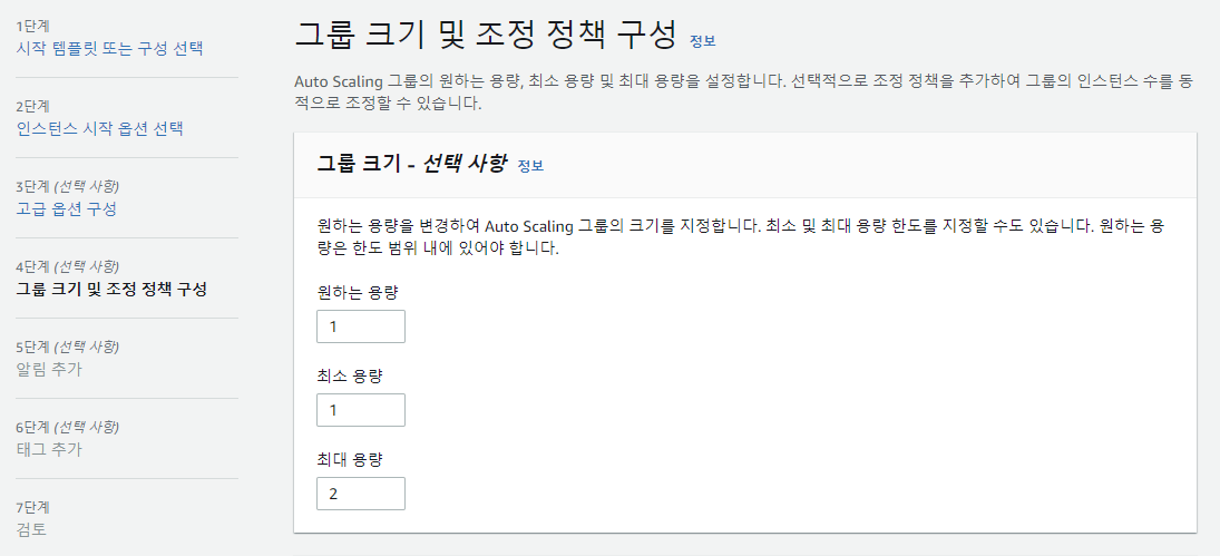 Auto Scaling 그룹 내 인스턴스 수를 자동으로 조절하기 위한 조정 정책을 설정하는 화면이다. Auto Scaling 그룹 내 최대 1대에서 최대 2대의 인스턴스를 실행하게 해서 평균 CPU 사용률이 80%를 기준으로 설정한다. CPU 사용률이 80%를 넘는지 안 넘는지에 따라 인스턴스 수가 최소 1대에서 최대 2대까지 자동으로 변하게 된다.