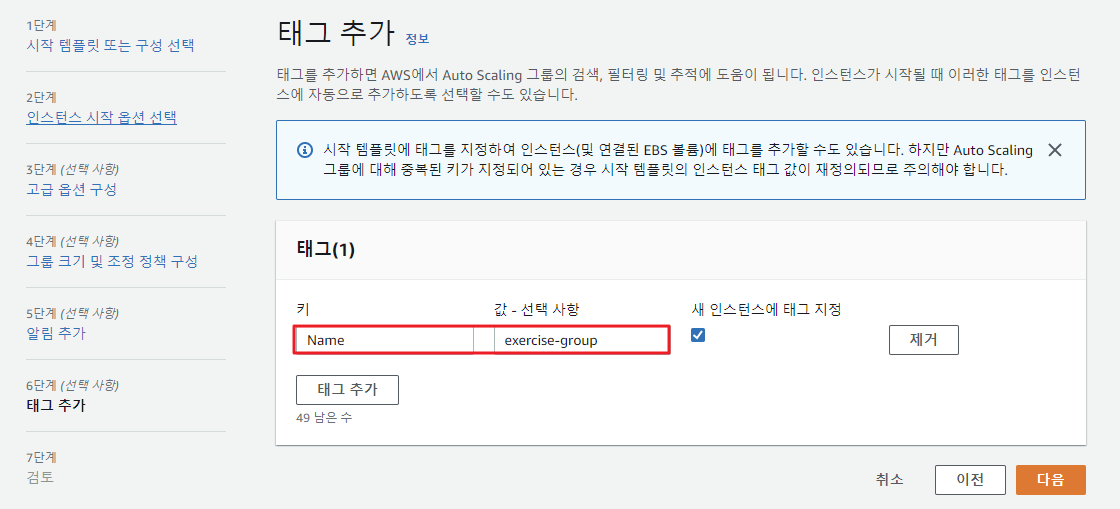 Auto Scaling 그룹 내 인스턴스들에 태그를 지정할 수 있는 화면이다. 여기서 태그를 지정하고 [새 인스턴스 태그 지정]을 체크하면 Auto Scaling 그룹 내 생성된 모든 인스턴스들은 다음 태그와 값들을 갖고 생성된다.