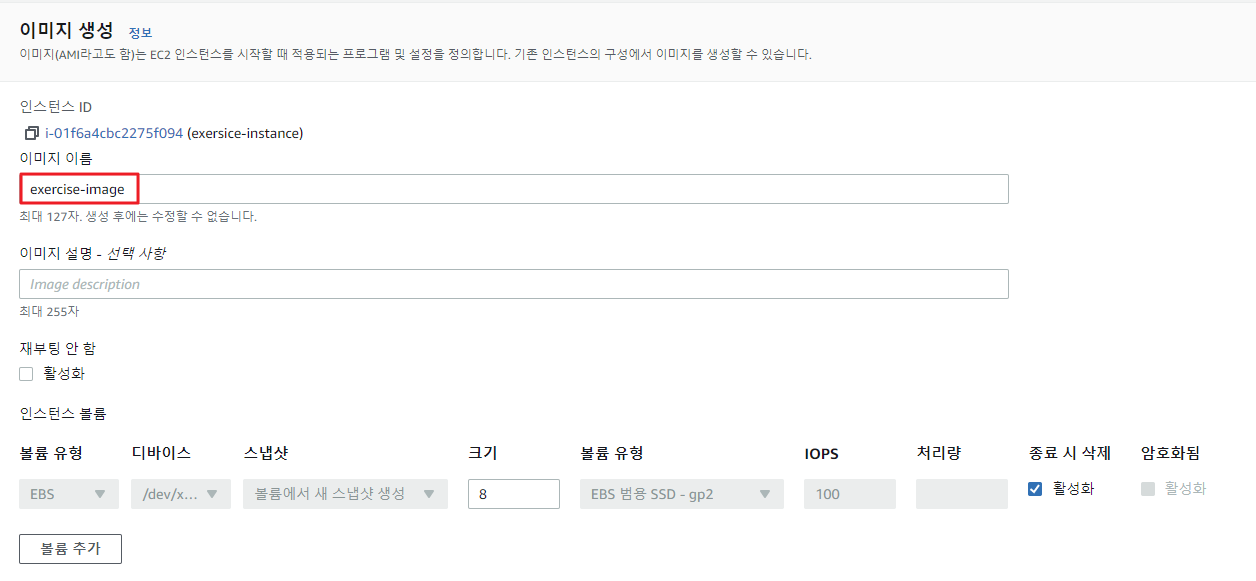 EC2 인스턴스를 stopped 상태로 변경 📌 인스턴스를 OS 등 파일 시스템에 있는 내용에 대한 스냅숏을 생성할 것이기 때문에 안전한 스냅숏을 위해 중지 상태로 변경하는 것이다.