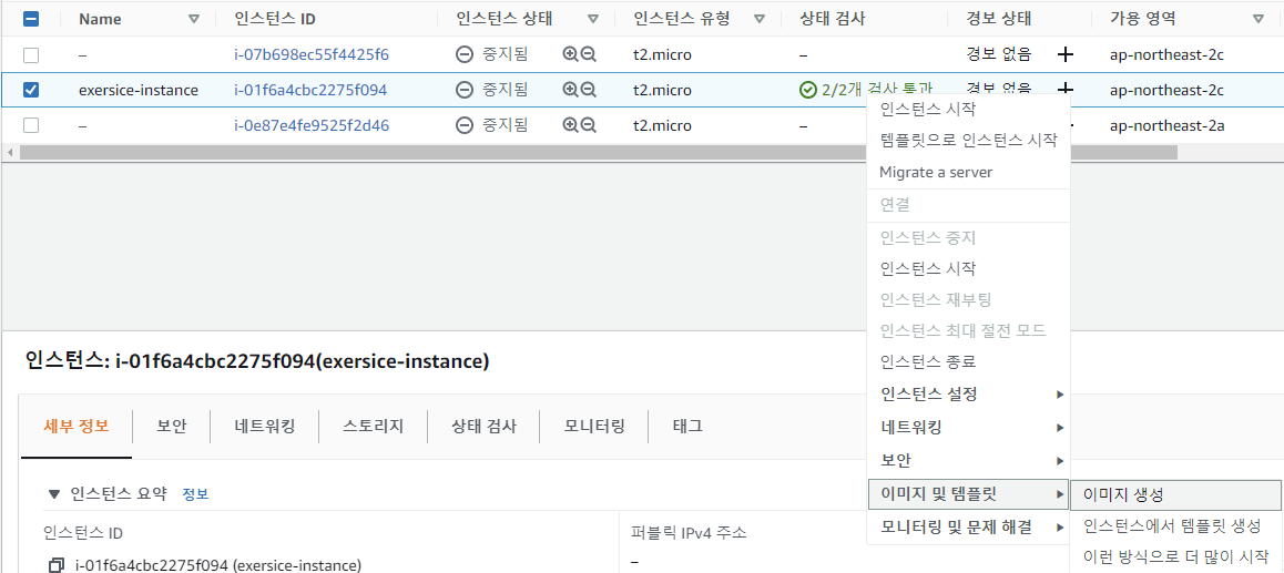 인스턴스에 대한 이미지를 생성하기 위해 인스턴스 우클릭 - 이미지 생성 인스턴스의 이미지 생성이미지 이름 입력