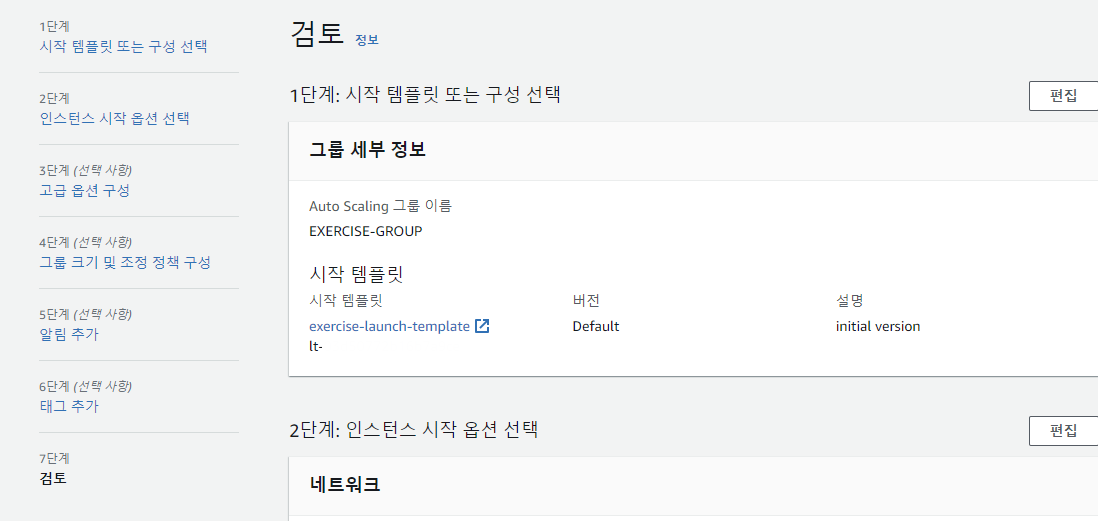 앞서 지정한 Auto Scaling 그룹의 설정값들을 마지막으로 검토 ➜ 올바르게 설정됐다면 [Auto Scaling 그룹 생성] 버튼 클릭!