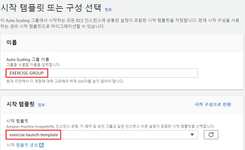 왼쪽 메뉴의 [Auto Scaling] - [Auto Scaling 그룹] 선택 후 [Auto Scaling 그룹생성] 📌시작 구성은 과거에 AWS에서 제공하던 기능으로 시작 템플릿과 똑같은 역할을 한다. 시작 템플릿이 시작 구성에 비해 버전 등 관리가 더 편리하기 때문에 시작 템플릿을 사용한다. Auto Scaling 그룹 생성 첫 단계Auto Scaling 그룹 생성 2단계