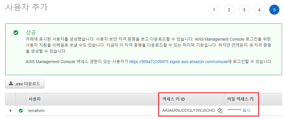 3. 태그, 검토를 건너뛰면 ACCESS_KEY_ID와 SECRET_ACCESS_KEY를 확인할 수 있다.