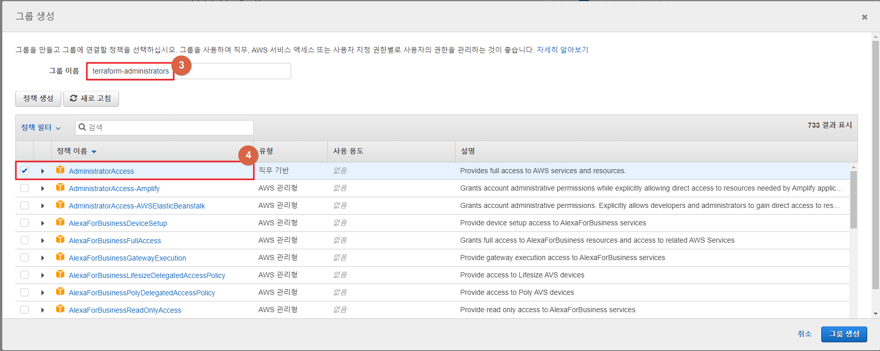 2. 사용자 그룹이 없을 경우 그룹 이름을 작성하고, 모든 AWS 리소스에 접근할 수 있는 관리자 접근을 허용해준다.