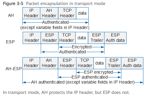 · ESP: IP 페이로드를 암호화하여 데이터 기밀성(Confidentiality)을 제공하므로 3자의 악의에 의해 데이터가 노출되는 것을 차단